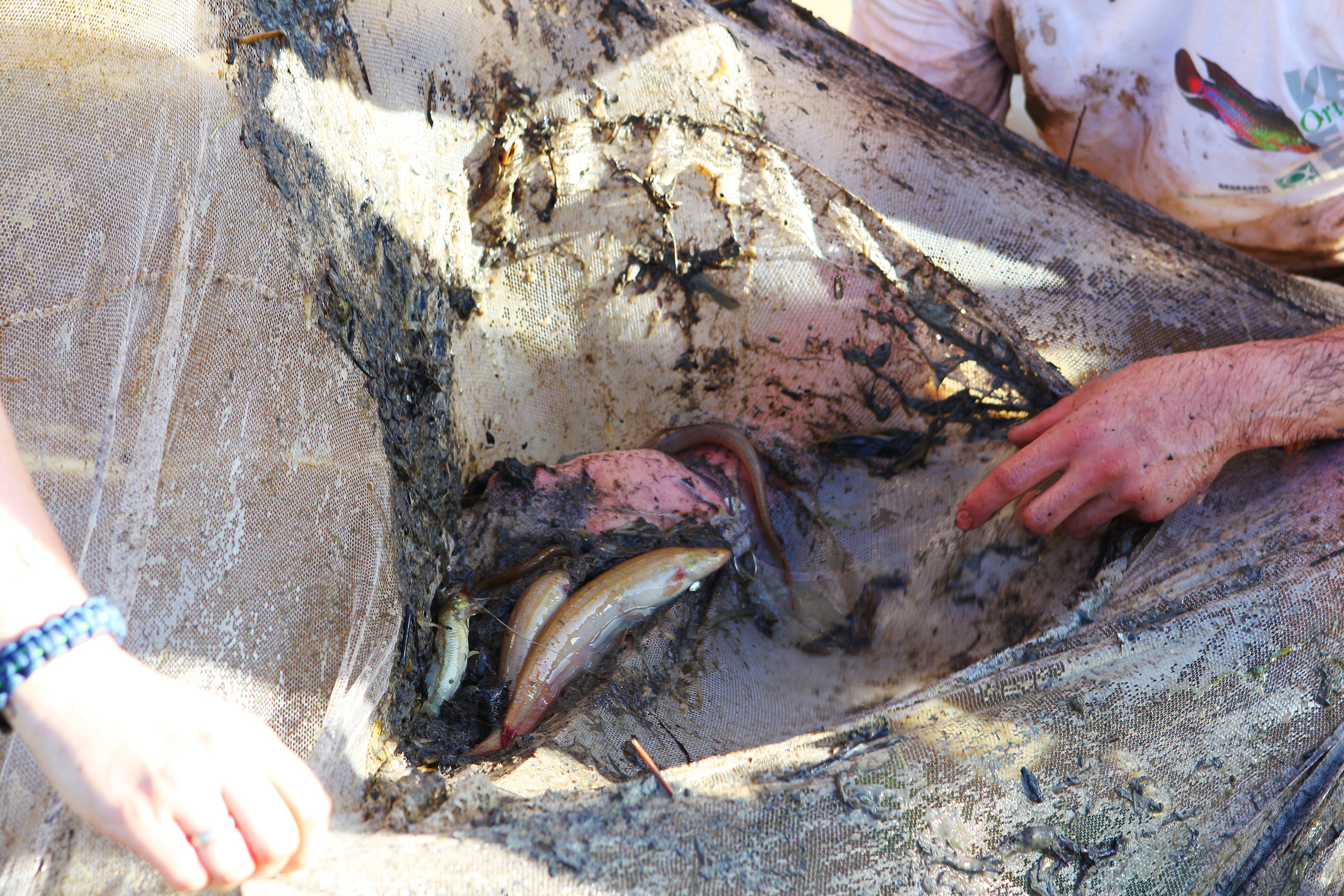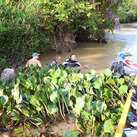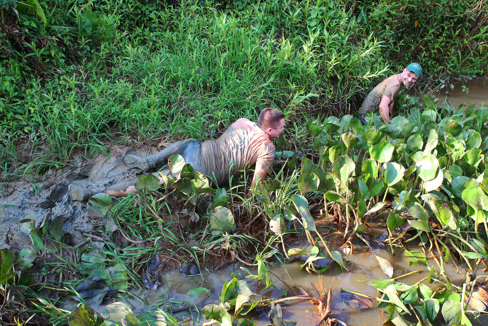 After the cattle trough we wanted to go to the pond where the electric eels were supposed to be. The pond was in sight but could only be reached through an area of swampy ground. Of course this didn’t keep us away and the first ones quickly learned that that a creeping movement worked the best. The fishing wasn’t great at the pond. We regret to report that we didn’t catch any electric eels. We did catch some closely related knifefish (the electric eel is not an eel) again, though. With such a biotope this is no surprise. Stagnant water without shady trees in the full tropical sun contains very little oxygen and only certain fish groups can survive there.