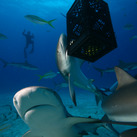Eight of us are divers, three are snorkelers. We divers meet beneath the boat at the seabed 12 metres deep. The sharks have already greeted us at the water surface and they go down with us. And stay with us, as dogs do. When we are all together they stay close to us. When we swim away from each other the sharks spread out too. There are 16 Caribbean reef sharks, 1.20 to 2.50 metres in length. The females, which can be recognised by their missing claspers, are the biggest and strongest built there. The sharks circle us curiously but don’t show excessive interest. Finally the food basket with fish heads is lowered towards us and fixed just above the ground. The sharks become more active, swim to the food basket and try to reach the food. Their full attention is on the food basket, not on us. Some other fish are interested in the food too and a huge cluster of sharks, snappers, groupers and mackerels is forming.