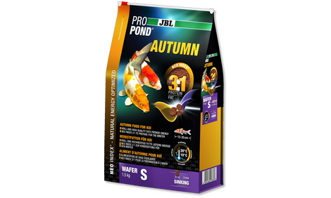 In autumn the fish need a higher protein and fat content than in spring to build up energy reserves for the coming winter. So both contents have the same ratio to one another, but are higher than in the spring food. In return the crude fibre and crude ash content is slightly lower in autumn, as the digestive tract needs to be less stressed over the coming winter. Furthermore the spring food is a floating food and the autumn food a sinking food, in order that the animals can slowly unwind in autumn without needing to exert themselves by feeding at the water surface.