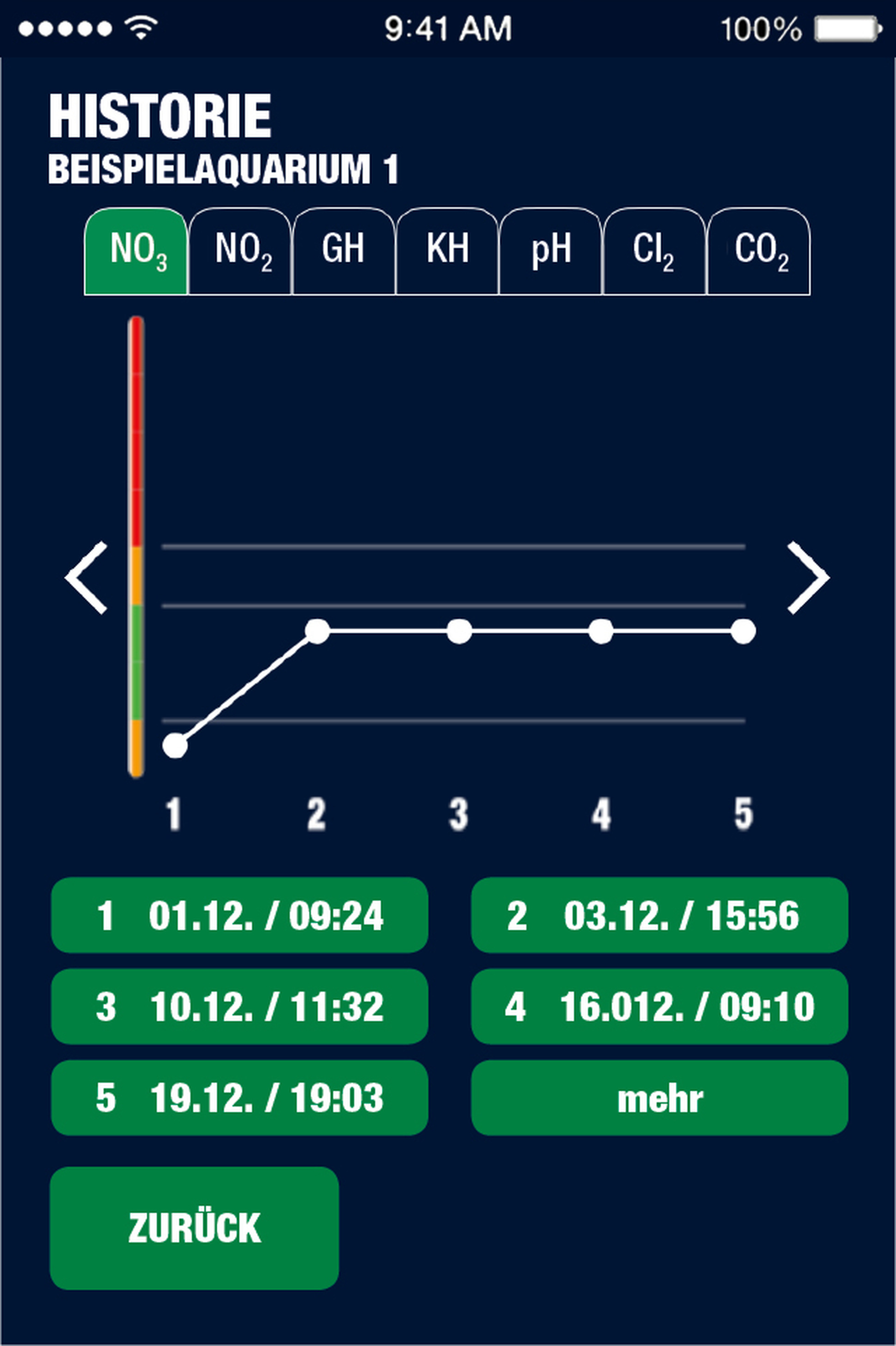 Here you can manage your aquariums and ponds. To start a new measurement to add to the history please select the appropriate category and click on “Continue” to start the measurement. The usual measuring process now takes place.
